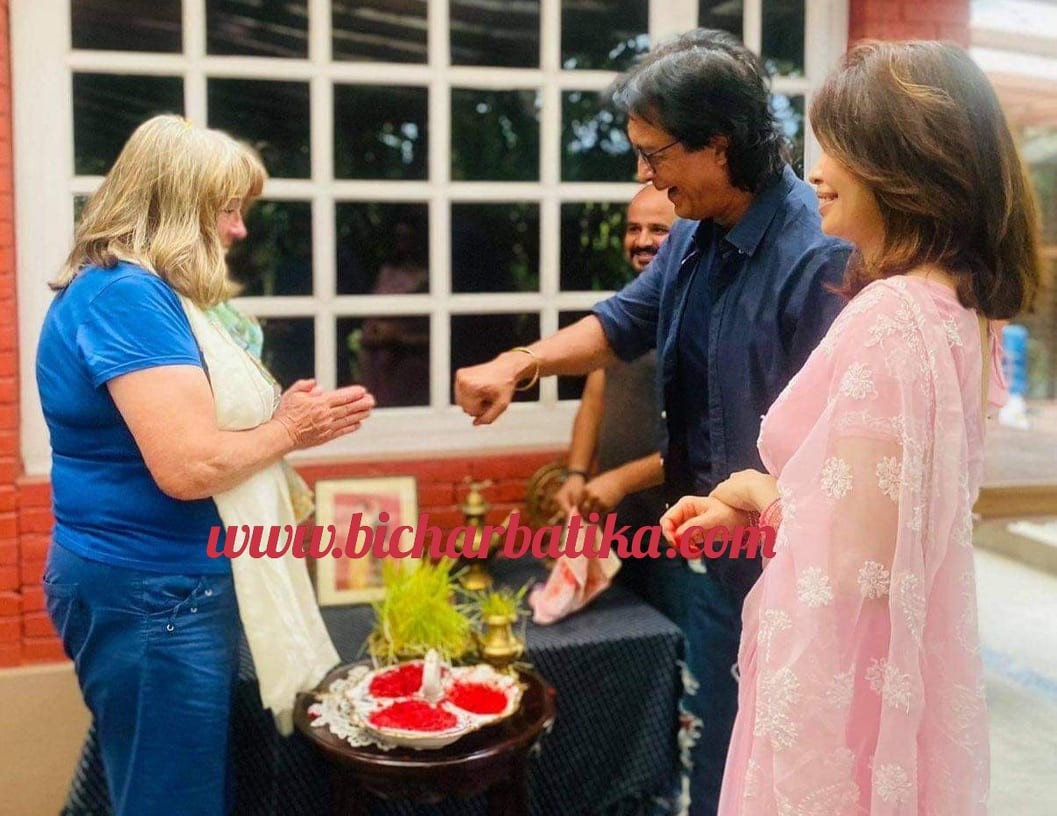 महानायक हमालका विदशी साथी तथा शुभेच्छुकहरु टिका लगाउन आएका हुन् । यसरी आउनहरुलाई हमालसँगै उनकी पत्नि मधु भट्टराईले समेत टिका लगाईदिएकी थिईन् ।