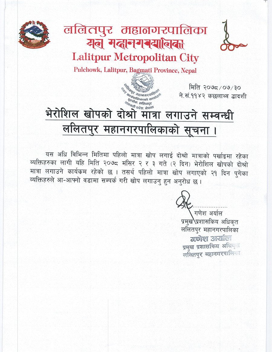 बिहीबार र शुक्रबार दुई दिन कोभिड–१९ विरुद्धको भेरोसेलको दोस्रो डोज खोप लगाइने ललितपुर महानगरपालिकाका प्रमुख प्रशासकीय अधिकृत गणेश अर्यालले जारी गरेको विज्ञप्ति अनुसार बताएका छन् ।