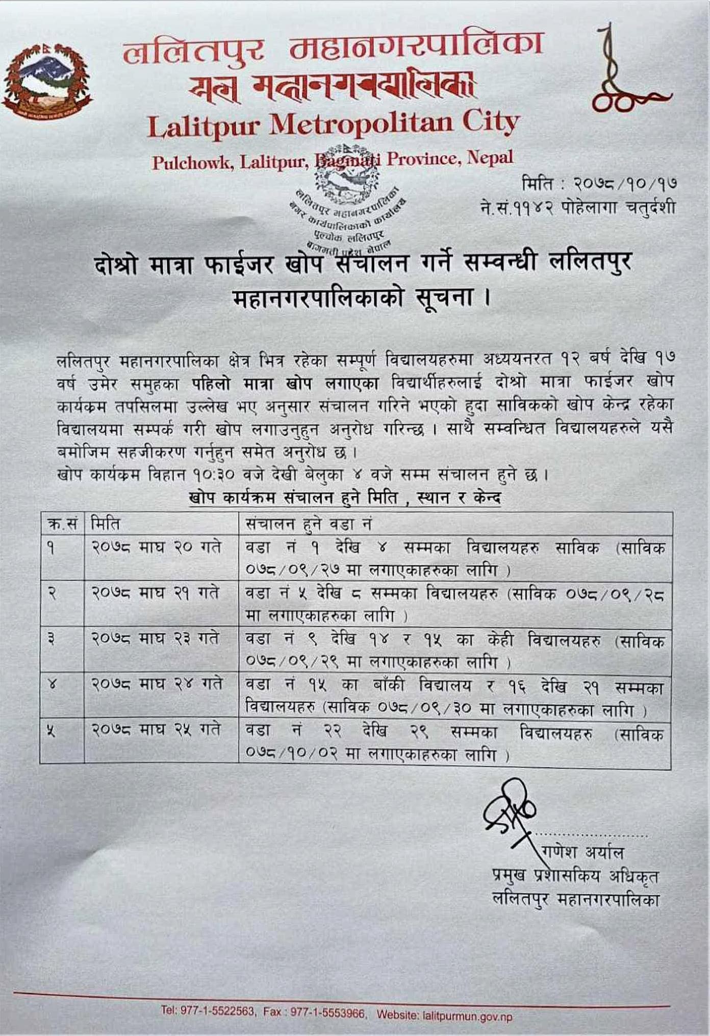 माघ १७, काठमाडौं । ललितपुर महानगरपालिकाले १२ वर्ष देखि १७ वर्ष सम्म उमेर समूहका बालबालिकाहरुलाई फाइजर खोपको दोस्रो डोज लगाइने भएको छ ।