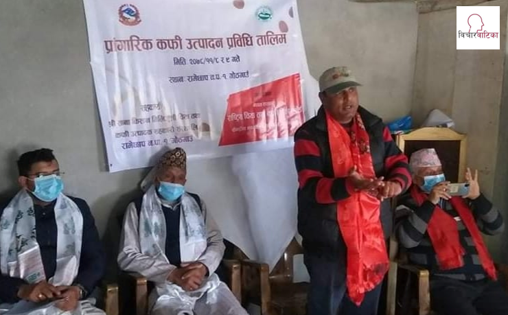रामेछाप न.पा.१ गोठगाउँ र लिखु तामाकोसी गा.पा.३र ४ बाट उपस्थित सानाकिसान मिलिजुली चिया कफी उत्पादन सहकारीको सदस्य हरूलाई नेपाल सरकार राष्ट्रिय चिया कफी बिकाश बोडका अधिकृत चन्द्र पुरीले प्रांगारिक कफी उत्पादन प्रविधिको बारेमा प्रशिक्षण दिएको वडा कार्यालय गोठगाउँका सहायक कम्प्युटर अपरेटर सानाकिसान मिलिजुली चिया कफी उत्पादन सहकारी संस्थाको सचिव दुर्गा बहादुर कठायतले विचार वाटिकालाई जानकारी गराउनु भयो।
