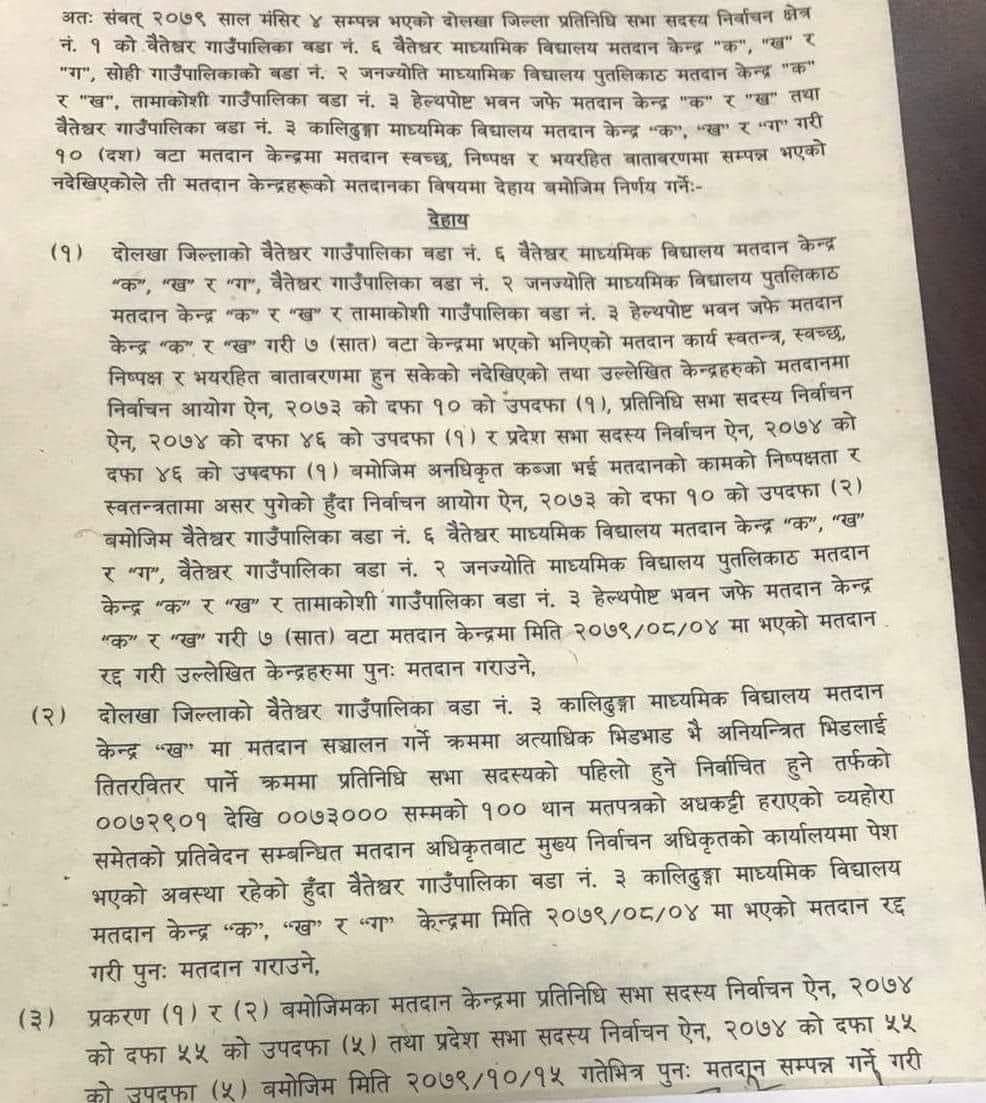 मंसिर ११, काठमाडौं, दोलखाको १० वटा बुथ कब्जा भएको ठहरसहित पुनः निर्वाचन गर्ने निर्णय गरेको निर्वाचन आयोगले जनाएको छ । प्रमुख निर्वाचन आयुक्त दिनेशकुमार थपलियाको अध्यक्षतामा आज बसेको आयोगको बैठकले यस्तो निर्णय गरेको हो ।