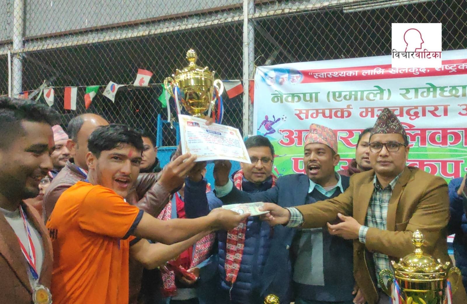 रामेछाप - काठमाडौं सम्पर्क मञ्च द्वारा आयाेजित अन्तरपालिका फुटसल -कप लाई दिपक कुमार खड्काले मुख्य प्रायाेजन गर्नुभएकाे थियाे भने राेएल ए वान इन्भेष्टमेन्ट प्रा.लि. ले प्रथम पुरस्कार ,हेवन टिमुर थकाली ले द्वितीय पुरस्कार ,ऐकृष्ण श्रेष्ठले तृतीय पुरस्कार ,जिरे खुर्सानी रेष्टाेले सान्त्वना पुरस्कार र भवानी ग्रुपले उत्कृष्ट खेलाडी पुरस्कार र सम्पूर्ण खेलाडीहरू लाई प्रमाणपत्रकाे प्रयाेजन गर्नुभएको थियाे ।