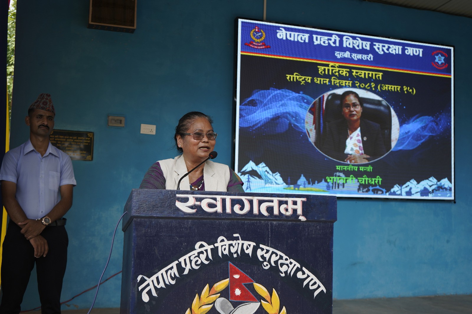 आज नेपाल प्रहरी विशेष सुरक्षा गण दुहबी सुनसरीले राष्ट्रिय धान दिवसको अवसरमा आयोजना गरेको विशेष कार्यक्रमलाई सम्बोधन गर्दै मन्त्री चौधरीले त्यस्तो बताउनुभएको हो । शान्ति सुरक्षा कायम गर्नका निम्ति सुरक्षा निकायको विशेष भूमिका रहेको भन्दै उहाँले जो जहाँ छ त्यो व्यक्ति वा निकायले देश र समाजका निम्ति विशेष भूमिका खेल्नुपर्ने बताउनुभयो ।