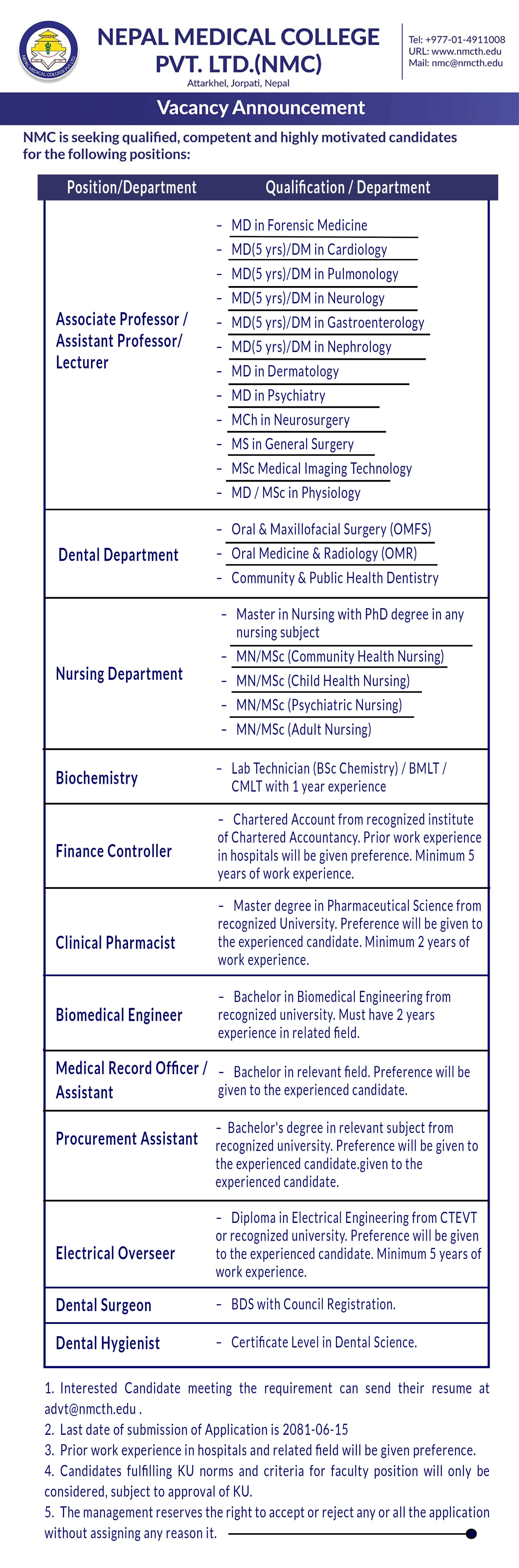 यसैगरी, लेखा नियन्त्रक, क्लिनिकल फर्मासिष्ट, बायोमेडिकल इन्जिनियर, मेडिकल रेकर्ड अफिसर, इलेक्ट्रिकल अफिसर, डेन्टल सर्जन समेत माग गरेको छ । इच्छुक उम्मेदवारले इमेल मार्फत आफ्नो व्यक्तिगत बायोडाटा पठाएर अन्तरवार्तामा सहभागी हुन पाउने छन् । असोज १५ गतेभित्र आवेदन दिइसक्नुपर्ने भनिएको छ ।