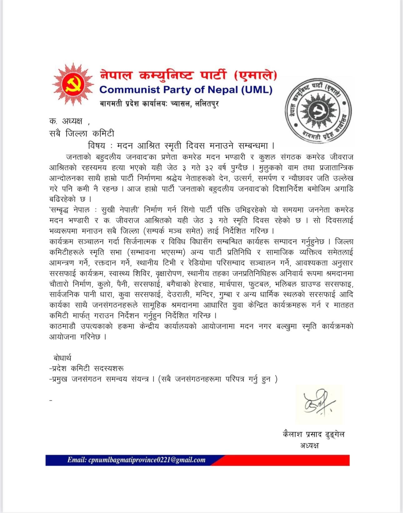 बैशाख ३१ काठमाडौं , नेकपा एमालेका तत्कालीन महासचिव जनताको बहुदलीय जनवादको प्रणेता मदन भण्डारी र तत्कालीन संगठन विभाग प्रमुख जीवराज आश्रितकाे ३२ औं मदन आश्रित स्मृति दिवस सिर्जनात्मक कार्यक्रमकाे आयाेजना गरि मनाउन मातहतका सबै जिल्ला कमिटी ,सबै जिल्लाका सम्पर्क मञ्चहरू लाई बागमती प्रदेश कमिटी अध्यक्ष कैलाश प्रसाद ढुङ्गेलले निर्देशन दिनुभएको छ ।
