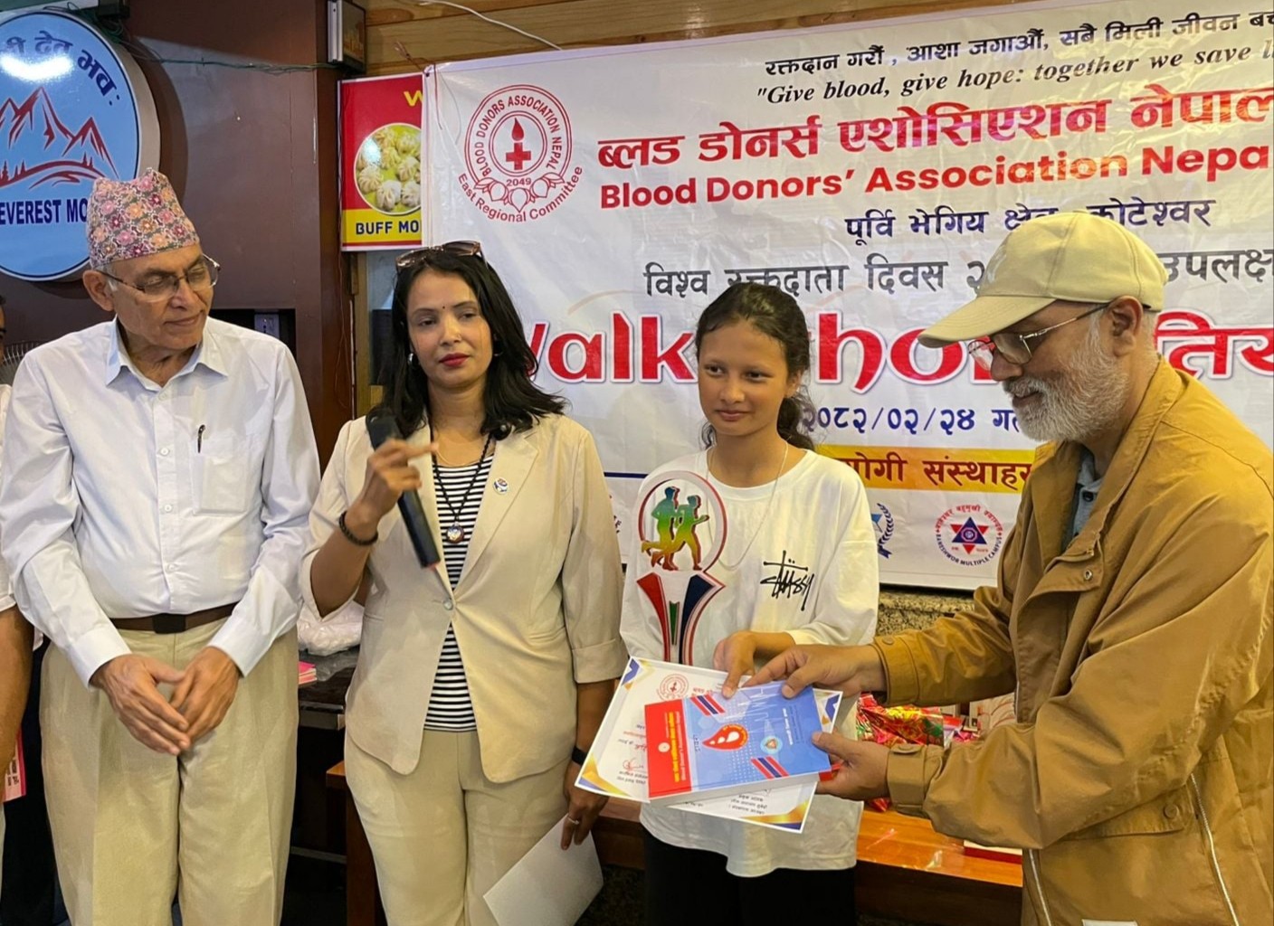 विश्व रक्तदाता दिवसका अवसरमा प्रकाशीत ब्लोदान स्मारिका लगायत वाकाथुन प्रतियोगीतामा विशेष सहयोग गर्नुहुने सहयोग दाताहरुलाइ मायाको चिनो समेत प्रदान गर्दै ब्लोदानको सहयोगमा आगामी जेठ ३० गते शुक्रवार कोटेश्वर चोकमा कोटेश्वर व्यवसायी संघको आयोजनामा बृहद रक्तदान कार्यक्रम हुन गहिरहेकले सबैको सहभागीताको लागी ब्लोदान पुर्वी भेगीय क्षेत्रका अध्यक्ष रिमालले अनुराेध। समेत गरीएको थियाे ।