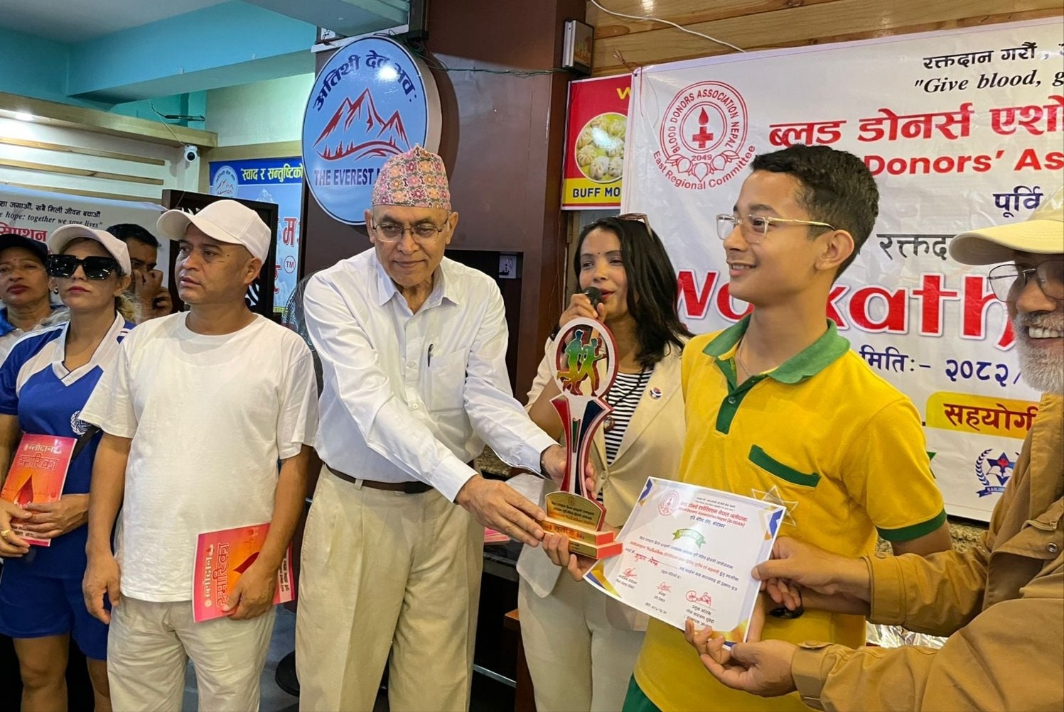 ‘रक्तदान गरौं, आशा जगाऔं, सबै मिली जीवन बचाऔं’ भन्ने मुख्य नाराकाे साथ वाकाथन प्रतियोगीतामा पुर्वी भेगीय क्षेत्रका विभिन्न संस्थागत विद्यालय तथा सामुदायीक विद्यालयका विद्यार्थी लगायत सर्व साधारणहरुको सहभागीता रहेको थियो वाकाथन प्रतियोगीता लाई दुई समूहमा विभाजन गरि १५ वर्ष भन्दा मुनिका लागी तिनकुने द एभरेष्ट मम बाट वानेश्वर पुगि पुन: तिनकुनेमा आहि सम्पन्न भएको थियो भने १५ वर्ष माथीका लागी तिनकुनेबाट शुरु भइ माइतीघर मण्डलामा पुगि पुन तिनकुने सम्मको रुट निर्धारण गरिएकाे थियो ।
