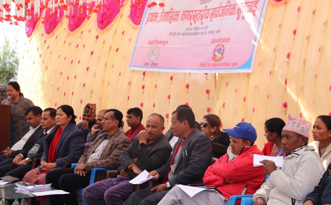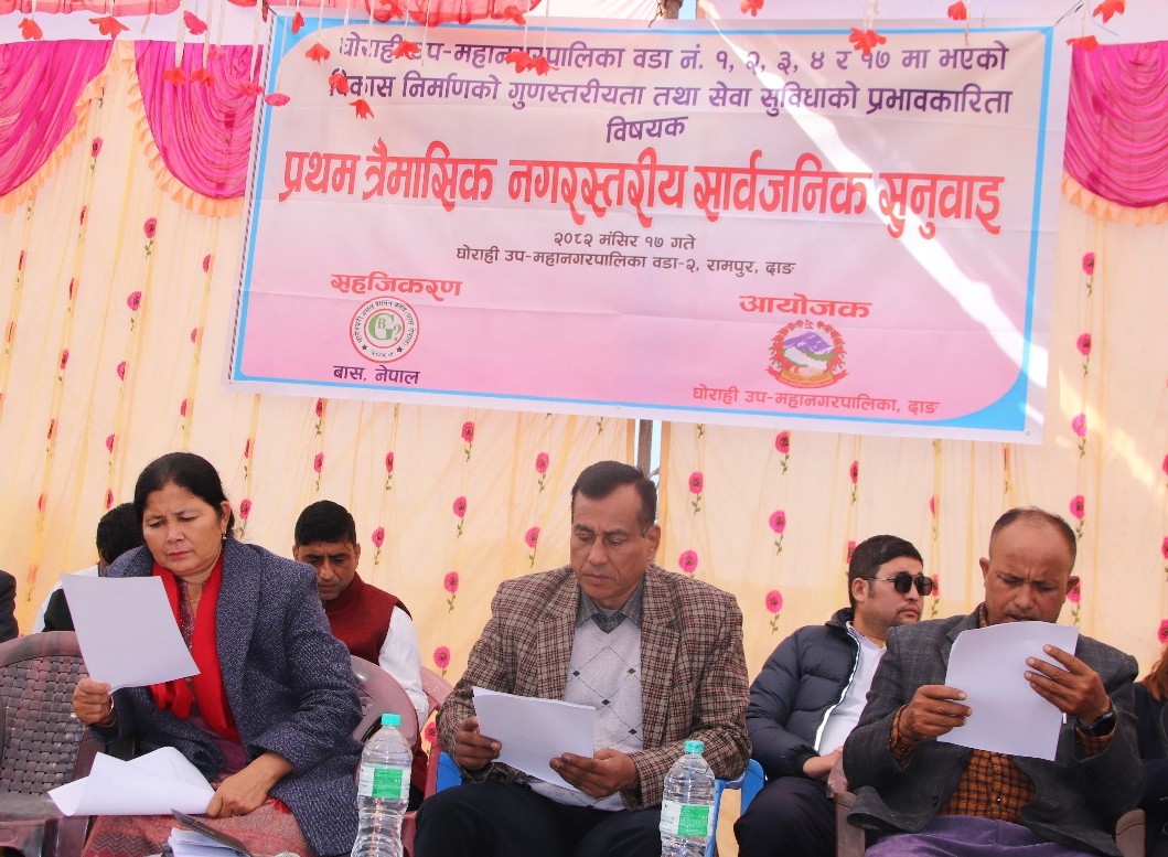 सार्वजनिक सुनुवाई कार्यक्रममा घोराही उपमहानगरका सुचना अधिकारी भमि बहादुर चौधरीले स्वागत मन्तव्य , बास नेपालका जन सम्पर्क अधिकृत माधव कार्कीले बर्हिगमन प्रतिबेदन र नागरिक प्रतिबेदन प्रस्तुत गर्नुभएकाे थिएभने कार्यक्रम सहजीकरण बास नेपालका कार्यक्रम अधिकृत रबिन्द्र बोहराले गर्नु भएकाे थियाे ।
