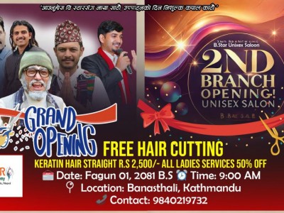 फागुन १ काठमाडौं , बि. स्टार युनिसेक्स सलुनकाे दाेेस्राे नयाँ शाखा बनस्थली काठमाडौंमा आज विशेष समारोहकाे आयाेजना गरि उद्घाटन हुदै छ। बि. स्टार युनिसेक्सका सञ्चालकले जानकारी गराए अनुसार नेपाली चलचित्र लाज शरणम् का निर्देशक कुमार कट्टेल ( जिग्री) कलाकारहरू अर्जुन घिमिरे ( पाडे) हरि...