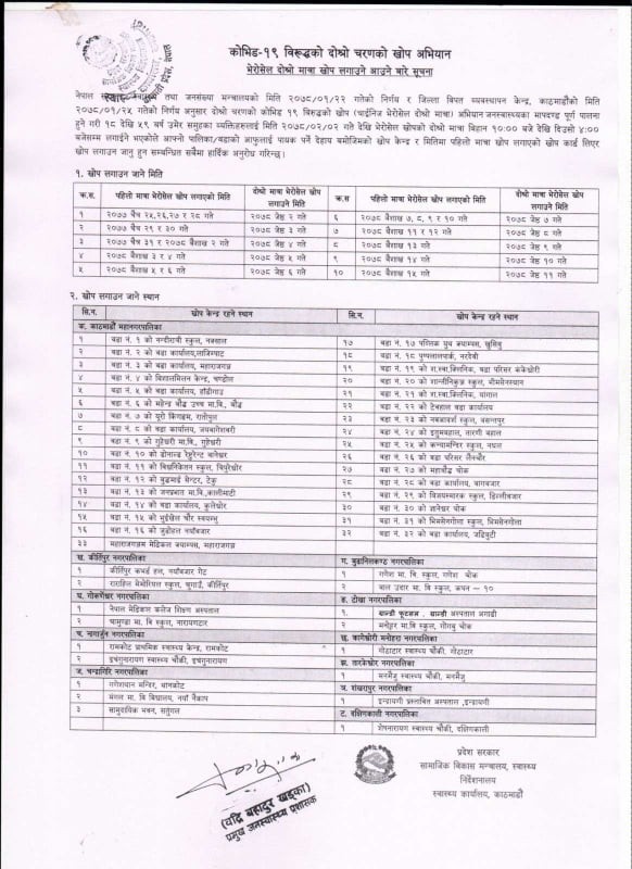 मन्त्रालयको स्वास्थ्य निर्देशनालयका अनुसार काठमाडौं बुढानीलकण्ठ नगरपालिकाको २ ठाउँ, गोकणर्ेश्वर नगरपालिकाको २ ठाउँ, टोखामा २ ठाउँ र नागार्जुन नगरपालिकाको २ ठाउँमा जेठ ११ गतेसम्म दोस्रो डोज खोप लगाउन लागिएको छ ।
