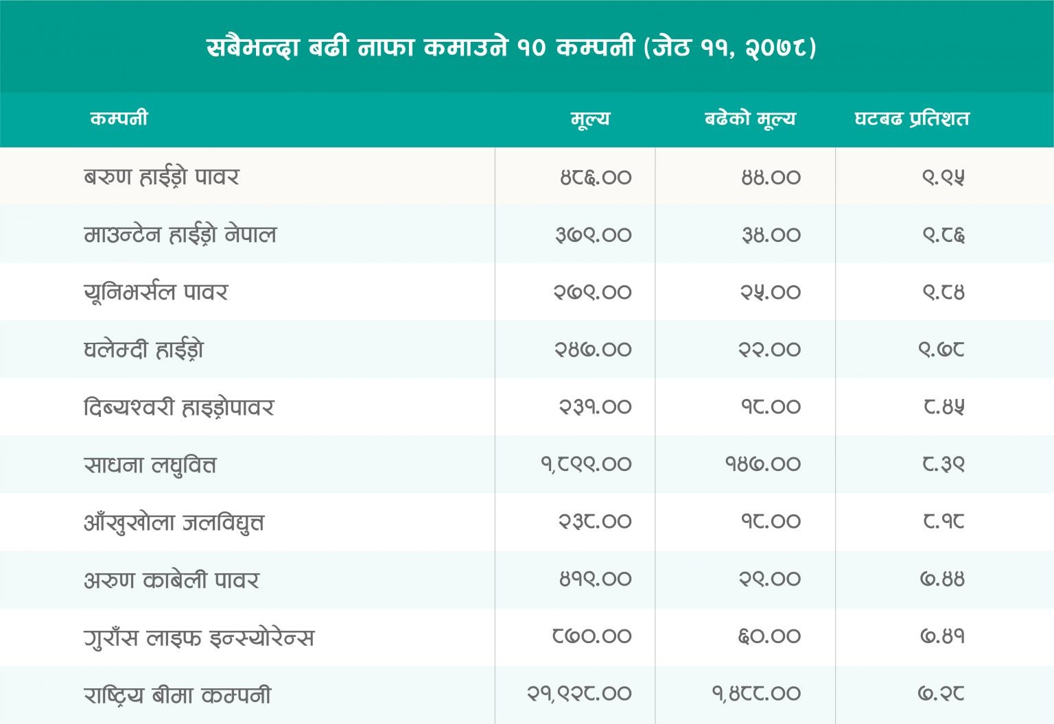 मंगलबार १ लाख १२ हजार १४८ वटा कारोबार हुँदा २१९ कम्पनीका २ करोड ३४ लाख ६५ हजार ६७५ कित्ता सेयर किनबेच भएको छ । जसअनुसार कारोबार रकम ११ अर्ब १३ करोड ३३ लाख ९८ हजार १०८ रुपैयाँ पुगेको छ ।