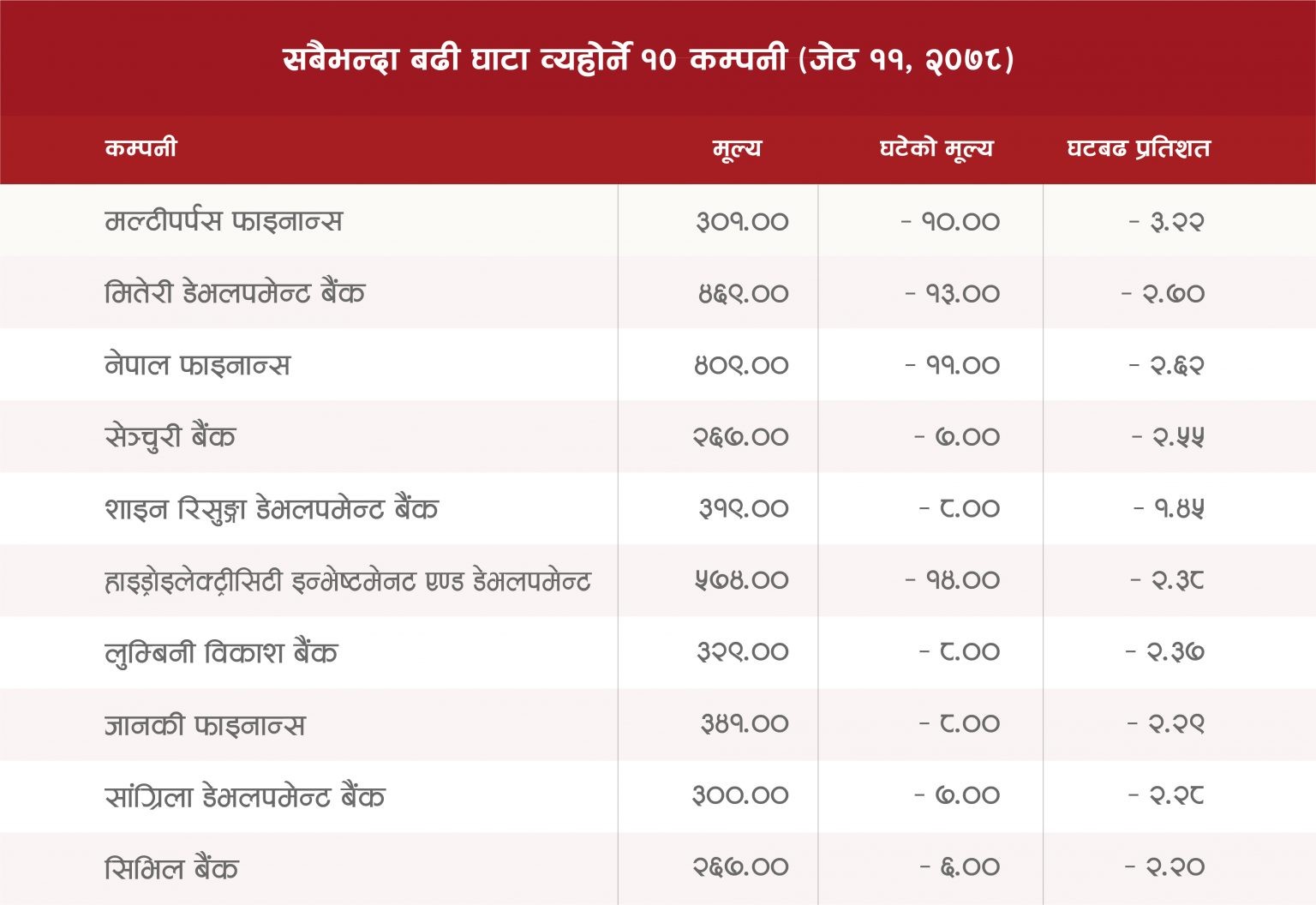 ‘क’ वर्गक कम्पनीहरुको कारोबार मापन गर्ने सेन्सेटिभ इन्डेक्स पनि ४ दशमलव ५१ अंकले घटेर ५ सय ३ दशमलव ९९ अंकमा झरेको छ ।