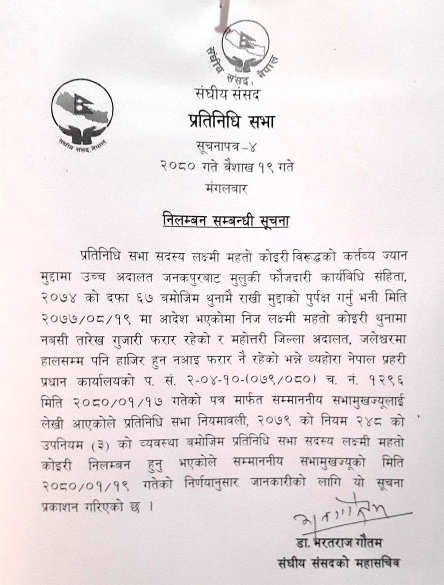 बैशाख १९ काठमाडौं, सभामुख देवराज घिमिरेले प्रतिनिधिसभा सदस्य लक्ष्मी महतो कोइरीलाई निलम्बन गरेका छन् ।