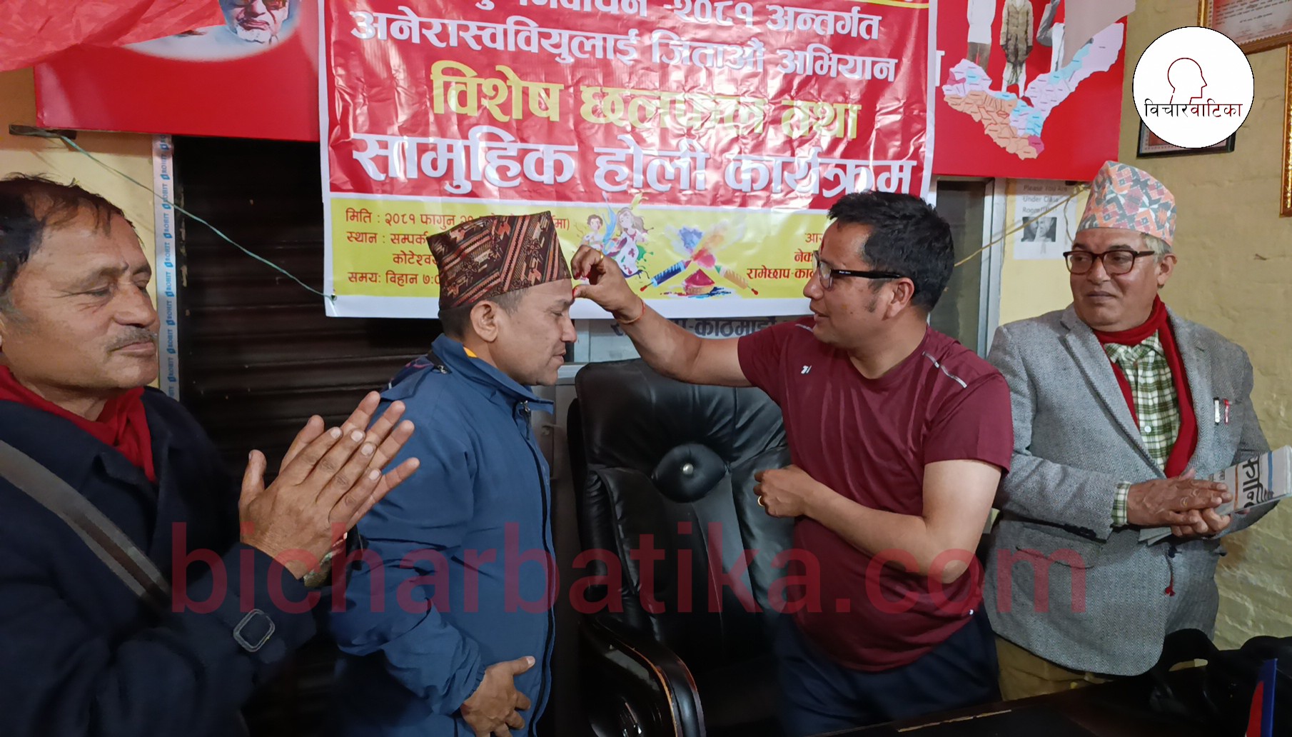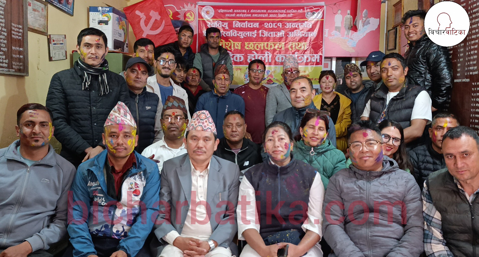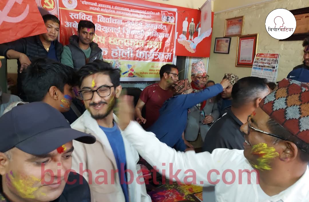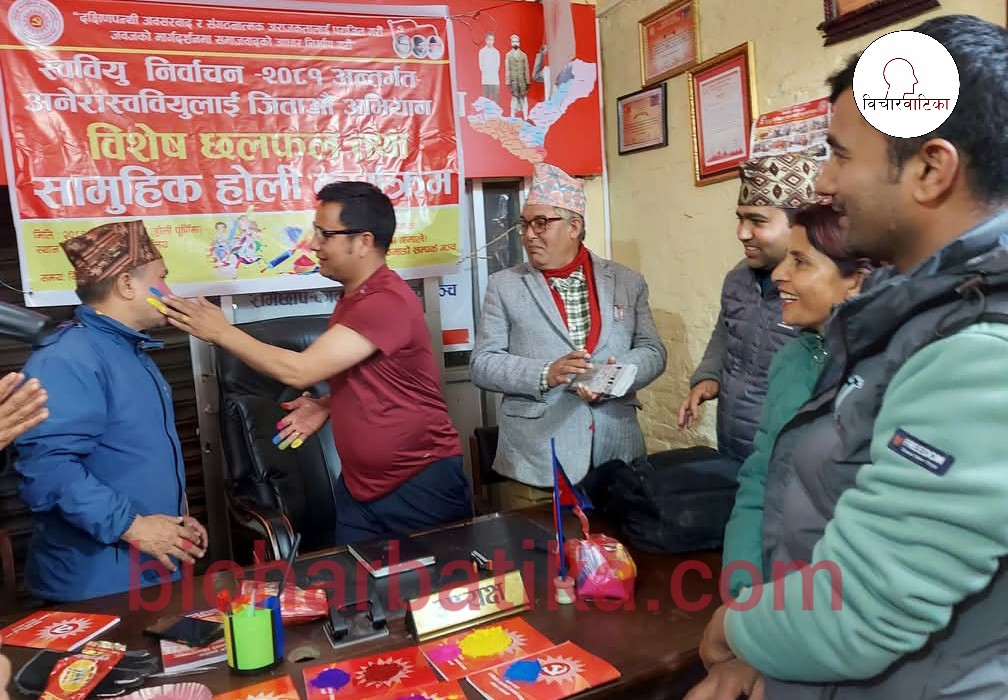रामेछाप - काठमाडौं सम्पर्क मञ्चको कार्यालय काेटेश्वरमा आयाेजना गरिएकाे कार्यक्रममा स्ववियु निर्वाचन विशेष छलफल पछि प्रमुख अतिथि ,अतिथिहरू लगायत सम्पूर्ण सहभागीहरूले एक आपसमा रंग लगाएर सामुहिक रूपमा हाेली समेत खेलेकाे थियाे ।
