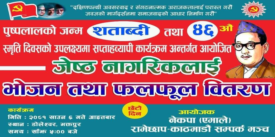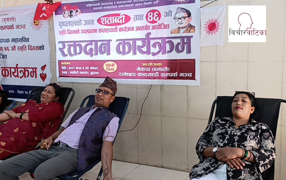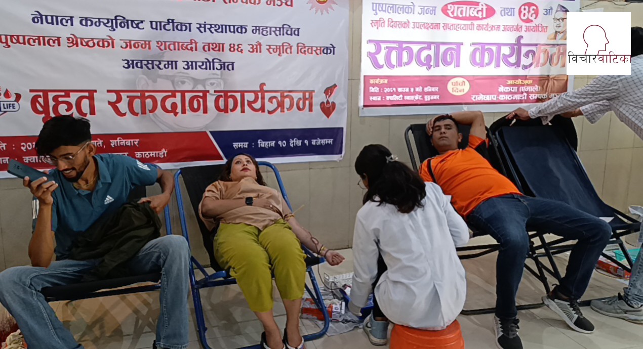श्रवण ५ काठमाडौं , नेपाल कम्युनिष्ट पार्टीको संस्थापक महासचिव पुष्पलाल श्रेष्ठको जन्म शताब्दी तथा ४६ औं स्मृति दिवसको अवसरमा रामेछाप - काठमाडौं सम्पर्क मञ्च द्वारा आयाेजित सप्ताहव्यापी कार्यक्रम अन्तर्गत आज पाँचौ दिनकाे छैटौं कार्यक्रम बृहत रक्तदान कार्यक्रम सम्पन्न भएकाे छ ।