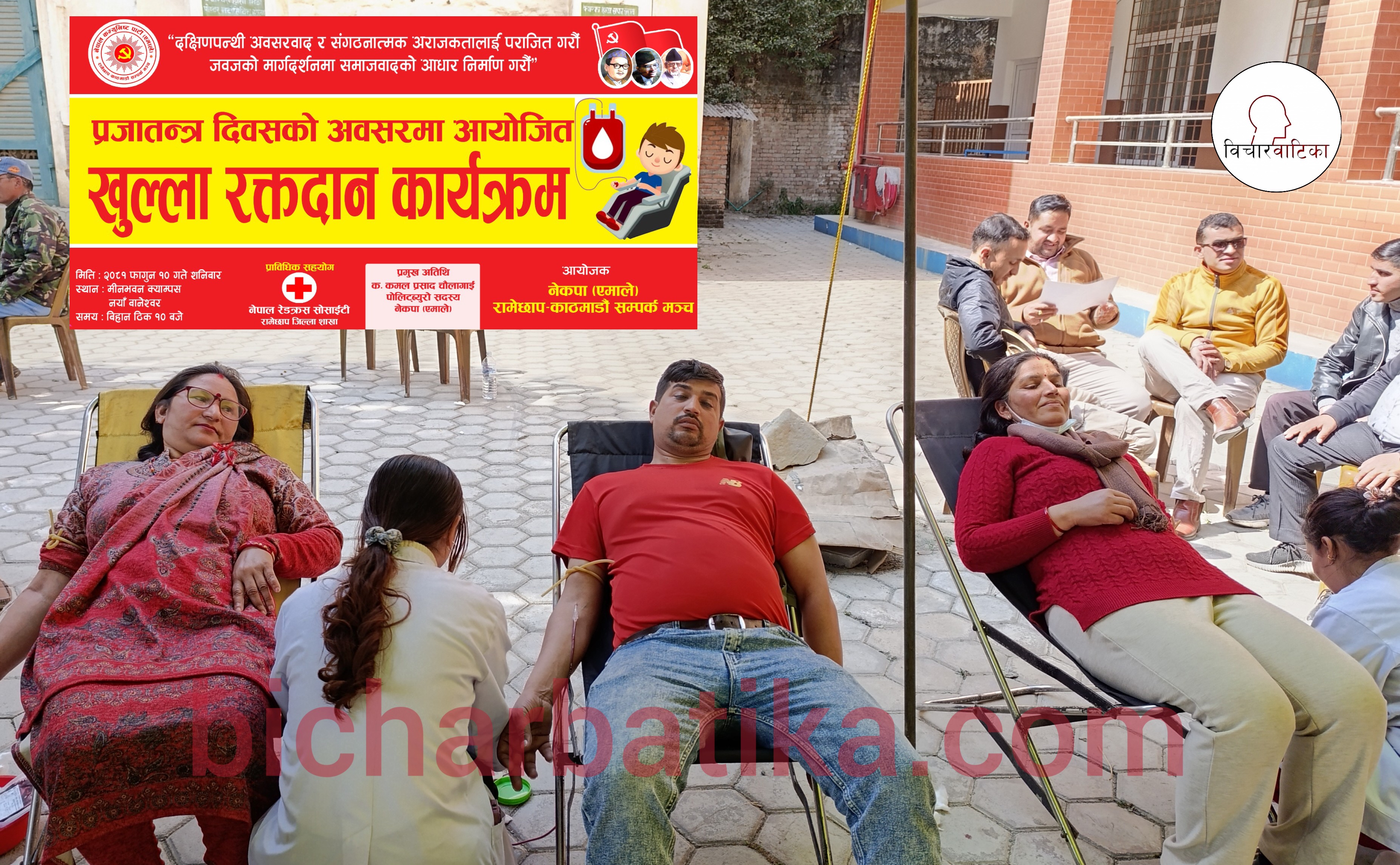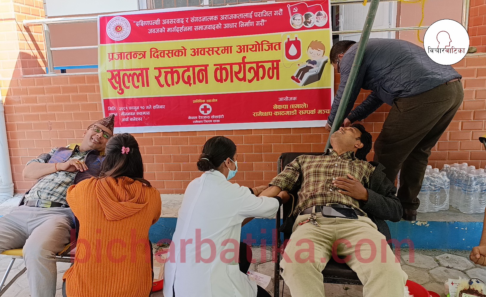 बहादुर फागुन १० काठमाडौं , नेकपा ( एमाले) रामेछाप - काठमाडौं सम्पर्क मञ्च द्वारा प्रजातन्त्र दिवसको अवसरमा आयाेजीत खुल्ला रक्तदान तथा नि: शुल्क आँखा शिविर कार्यक्रम सफलता पूर्वक सम्पन्न भएकाे छ ।